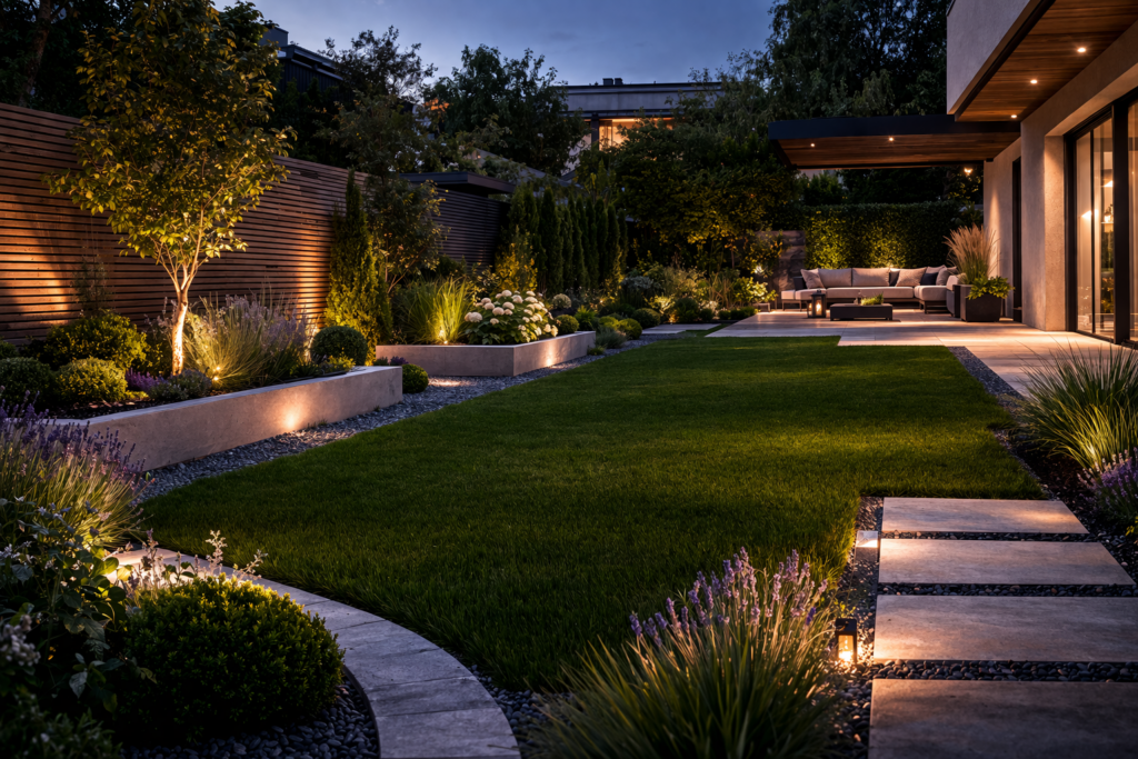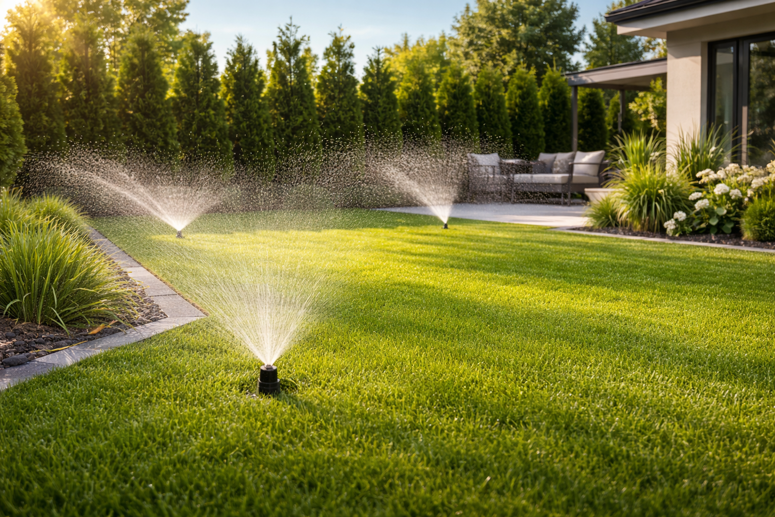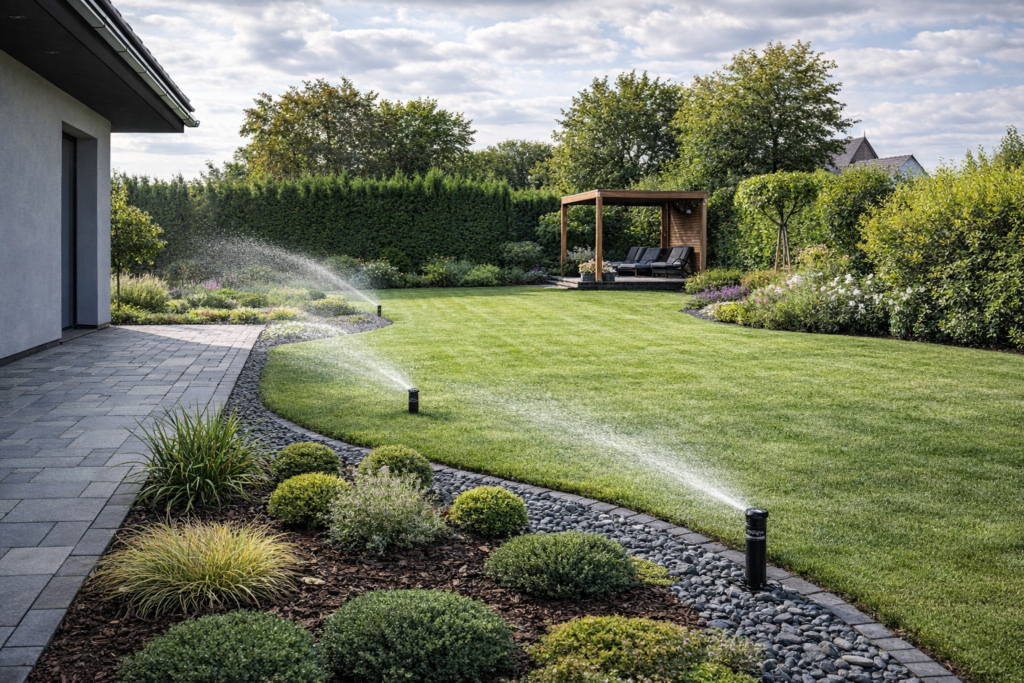 Nowoczesny ogród z automatycznym nawadnianiem